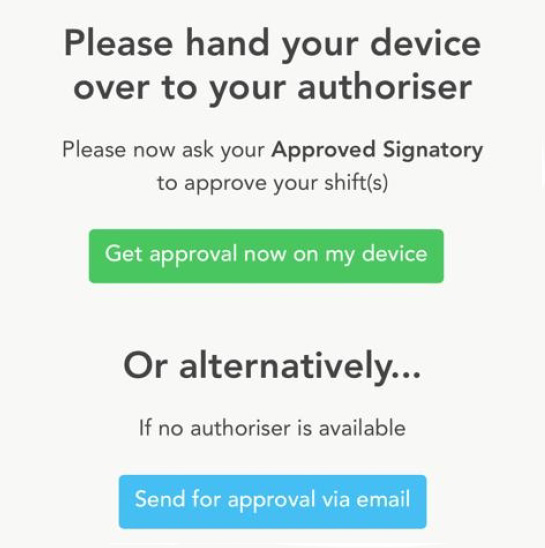 If a timesheet authoriser is not available at the end of a shift, the timesheet can be sent to them via email to complete when possible.