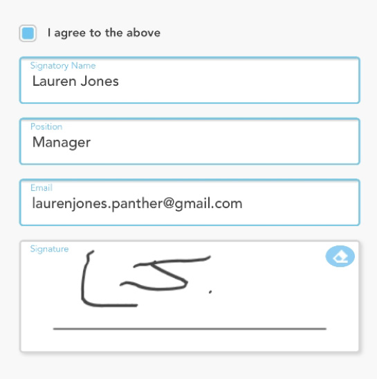 Step 4: Click ‘I agree to the above’ to confirm you’ve read the declaration. Type your name, position, email and signature. Your information will be saved for future timesheets.