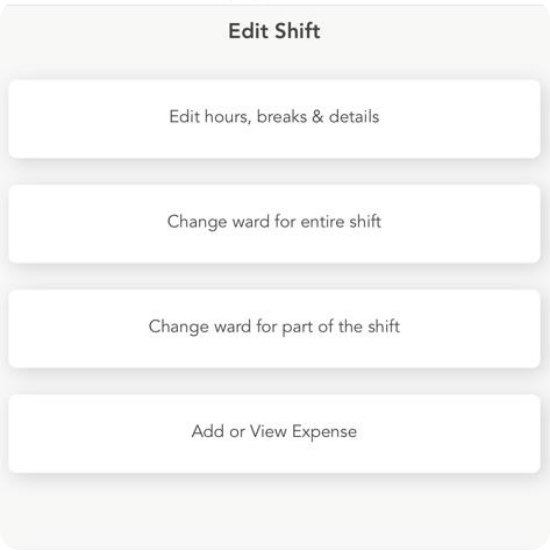 Step 2: For each shift, you will be able to edit hours, breaks, change ward for part of the shift or for the entire shift and add expenses.