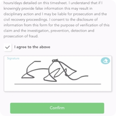 Step 5: When you are ready to send your timesheet over for review you will be required to sign a declaration and click ‘Confirm’.