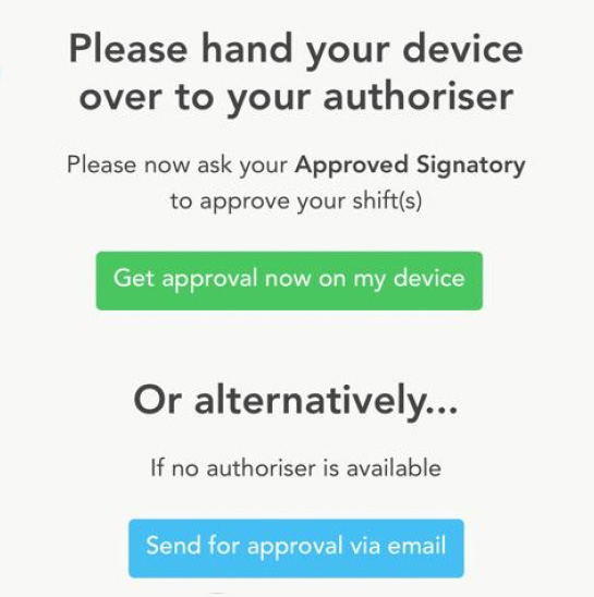 Step 6: Next, pass your phone over to your timesheet authoriser who will approve your timesheet. This can be done via email if your authoriser is not available.